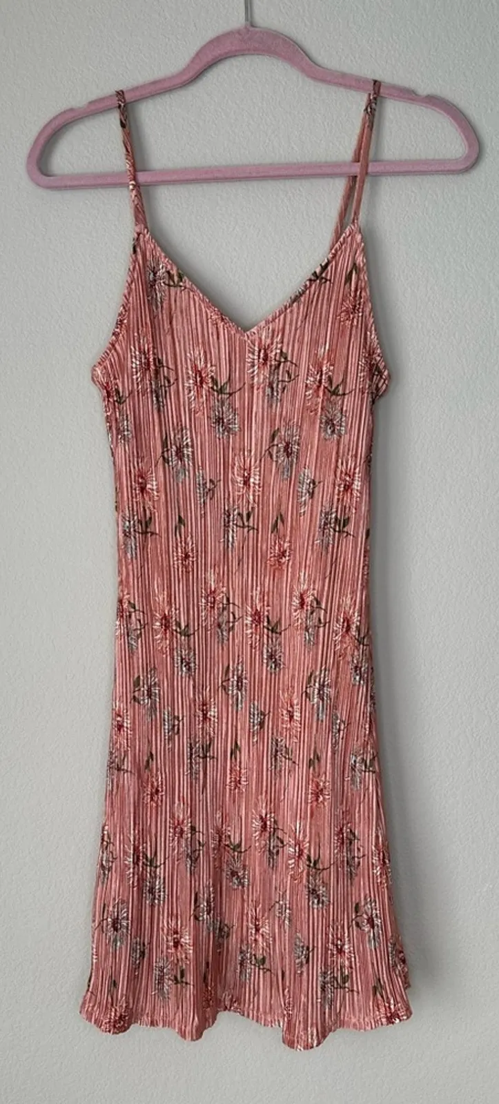 Like new condition. Never worn. Dress features pleated satin fabric with spaghetti straps and V neckline. A-line shape and fully lined mini silhouette. Sleeves have been removed. Measurements are as follows: 13.75 inches across from armpit to armpit, and 36 inches in length including straps, 12.5 inches across at the waist. All measurements are taken while lane flat. Fabric has lots of give, and stretch. fabric content is 100% polyester. Made in the USA.