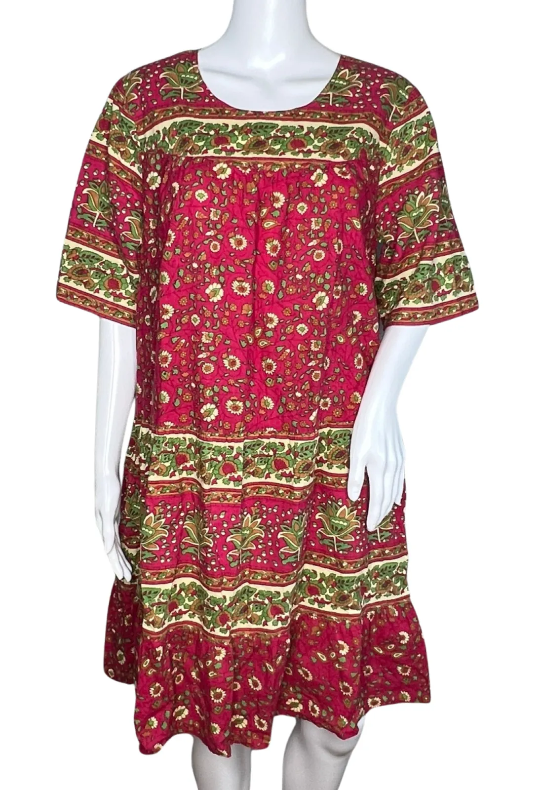 The Vermont Country Store Dress Womens Medium Multi RedFloral Mumu Boho Hippie Women's Size Medium A-Line Ruffle Bottom Short Sleeve Round Neck Pockets Relaxed Fit 100% Cotton Holiday Colors Measurements are Approximate: Length 36" Armpit to Armpit 22" Gently Used Condition. No Rips Tears or Stains (1703)
