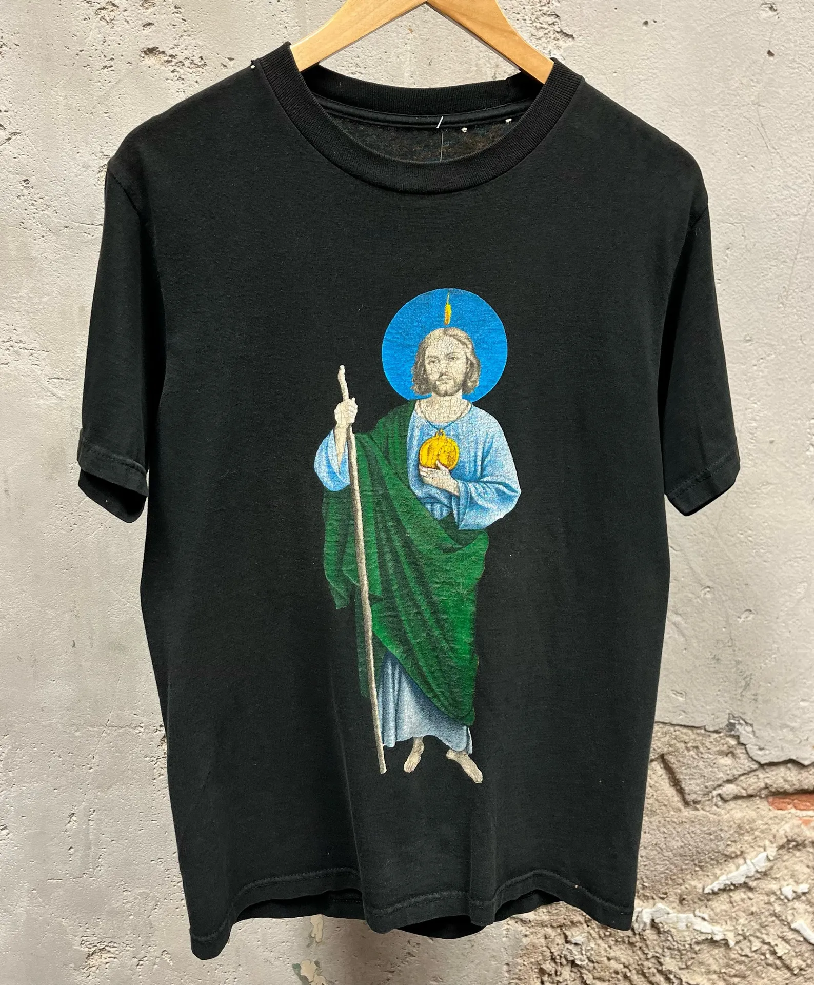 In good condition! Black short sleeve unisex tee. Painted graphic on the front of St. Jude. Cotton m... Show more