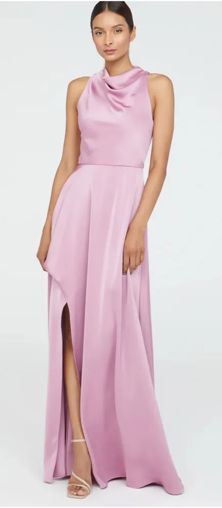 NWT Theia Amara Cowl Neck Drape Gown, in the color Lilac Whisper, size 4 The Amara gown features a draped, high-neck cowl and an asymmetrical skirt slit enhancing fluidity and movement. Crafted from double faced satin, it’s soft cascade flounce, adds an elegant touch. Cowl neck Faux wrap silhouette Floor length Sleeveless This is in new condition with the tags still attached. No flaws. Measurements taken flat. Pit to pit 16.5” Waist 13.5” Length aporox 70” from top of shoulder to hem