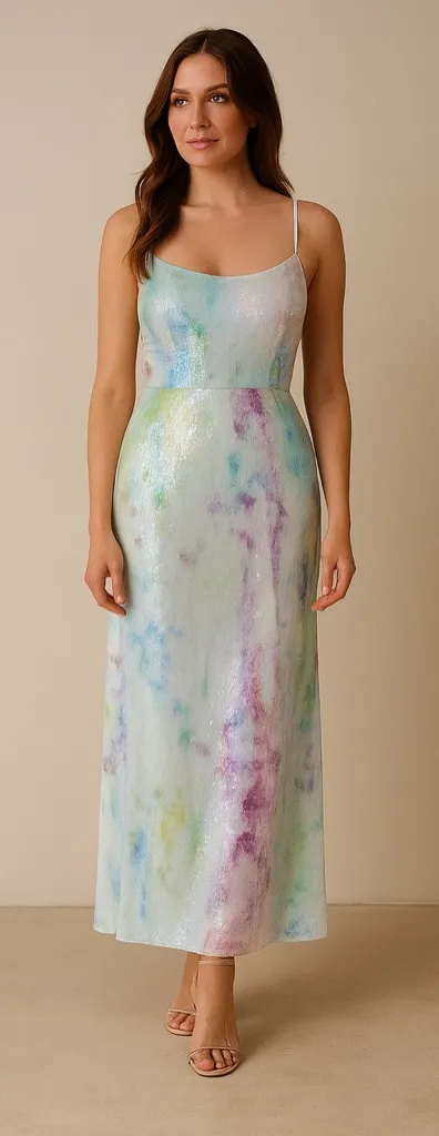Capture ethereal elegance with this THEIA sequin maxi dress, a breathtaking masterpiece that shimmers with a captivating tie-dye watercolor effect. Imagine yourself gliding through any event, the iridescent sequins catching the light with every movement, while the soft pastel hues of lavender, mint green, and sky blue create a dreamy, artistic canvas. The delicate spaghetti straps and sleek silhouette flatter your figure, offering a sophisticated yet playful charm perfect for making a memorable entrance. This gown is an ideal choice for weddings, galas, or any special occasion where you wish to radiate pure radiance and grace. Measurements: • Bust: 20 in • Waist: 18 in • Length: 60 in • Hips: 21 in Keywords: THEIA dress, sequin gown, tie dye print, watercolor dress, formal dress, evening wear, special occasion, prom dress, bridesmaid dress, elegant, shimmering, pastel colors, strappy dress