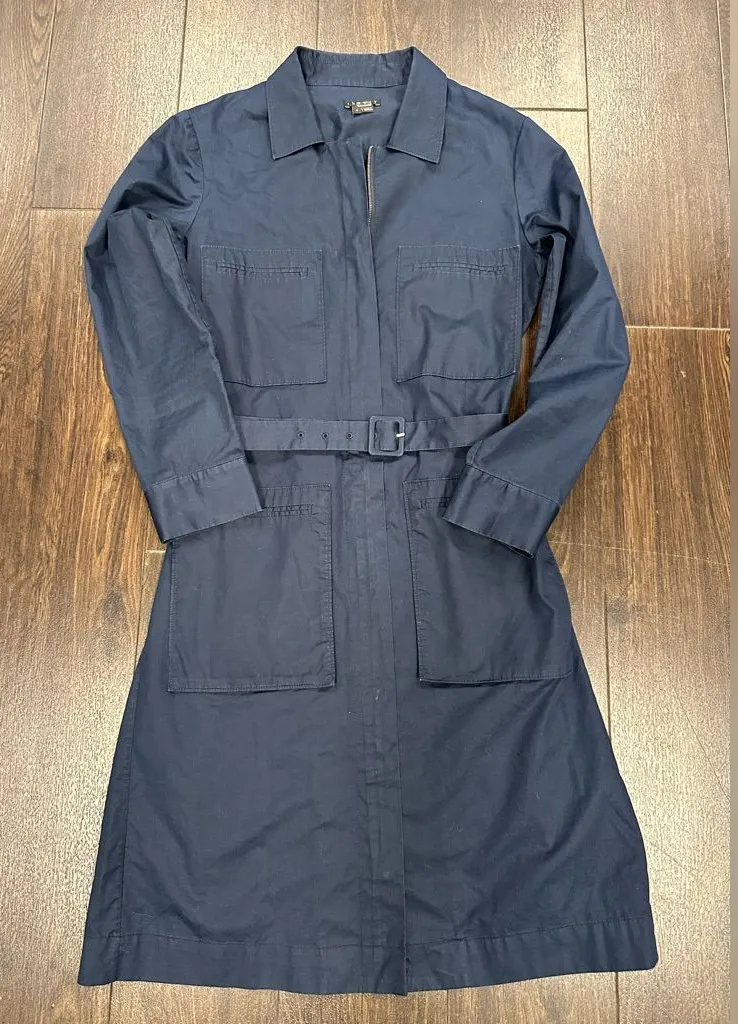 Chic dark blue trench coat with belt. Features front pockets and sleek design.
