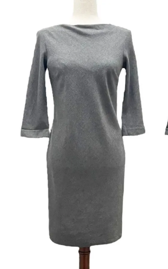 Stretch wool fitted knee-length sheath from Theory. Gray flannel stretch wool blend. Bateau neck w... Show more