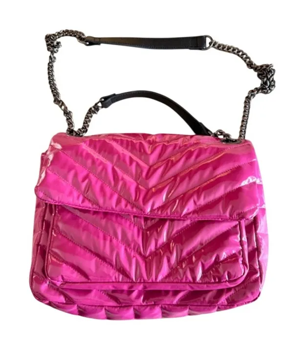 This Think Royln puffer crossbody is bold, lightweight, and super functional. The glossy hot-pink quilted exterior pops instantly, while the chain-and-nylon strap gives it that effortless street-style look. Roomy interior with zipper pocket, front flap compartment, and a comfortable shoulder drop that can be worn crossbody or on the shoulder. Clean interior, smooth hardware, and ready to carry. Measurements: 12" W × 10" H × 3" D Strap: Adjustable chain/nylon hybrid Features: Quilted puffer shell, glossy finish, zip pocket, magnetic flap closure Condition: Excellent preowned — no stains, rips, or odors. Think Royln handbag, quilted crossbody, pink puffer bag, nylon chain strap purse, streetwear purse, bold color bag, lightweight quilted bag
