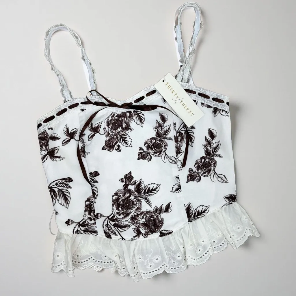 - New with tags (NWT) condition Brand: Thirty Thirty Size: S Color: White/Brown Department: Women Type: Tank Style: Camisole Material: Polyester Pattern: Floral Accents: Bow Features: Elastic Spaghetti straps, Lace trim, Smocked back, Eyelet detail Fit: Regular Fabric type: Polyester Occasion: Casual Season: Spring Strap type: Spaghetti ⚡️Measurements: approximately Chest width 14.25" Total length 19" 🌟Smoke Free Environment 📦Ships Next Business Day