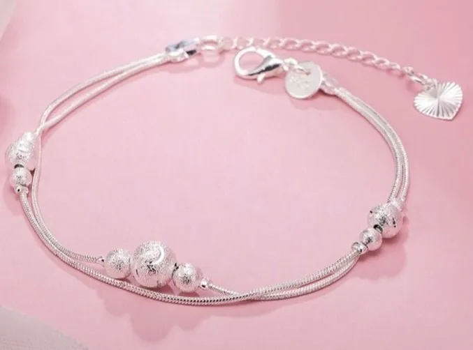 This charming bracelet features a delicate double-strand snake chain design accented with textured, silver-toned beads. The adjustable length and subtle heart charm on the extender make it a perfect, feminine accessory. Key Features: • Design: Double-layered, fine snake chains for a stacked look. • Accents: Features clusters of polished and textured spherical beads. • Closure: Secure lobster clasp with an adjustable extender chain. • Detail: A small heart-shaped dangle charm on the end of the extender. • Style: Minimalist, elegant, and versatile for everyday wear or dressing up. • Material: Silver-plated or sterling silver, providing a bright, lustrous finish.