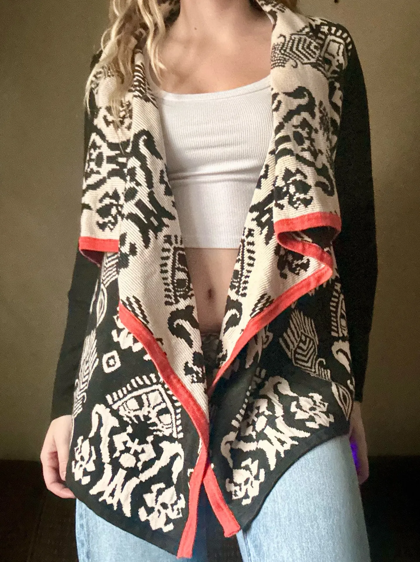 Tagged size S. This THML waterfall cardigan features an open-front, draped silhouette with a striking gray and cream mixed pattern accented by bold orange piping along the edges. The flowy, unstructured fit makes it easy to layer and flattering on multiple body types. Made from a soft 55% acrylic and 45% cotton blend, it’s lightweight yet cozy with comfortable stretch. Length measures approximately 25 inches; pit-to-pit varies due to the waterfall style. Made in China. Shows general light wear with no major flaws. A perfect statement layering piece for boho, indie, or art-teacher-inspired outfits. tags: boho, indie, artsy, eclectic, statement layer, fall layering, creative chic, relaxed silhouette, casual cool, modern bohemian, effortless style, everyday layering, cozy aesthetic