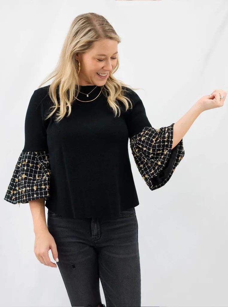 THML Tweed Angel Sleeve Top black-and-gold tweed detailing on the bell sleeve NWT. Size small. Round neckline Dramatic flutter sleeves Tweed contrast with gold threading Clean, fitted hemline
