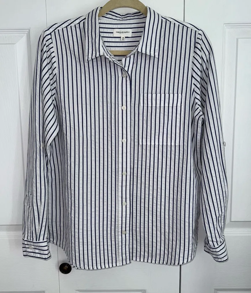 Thread & Supply Marina Seersucker Stripe Button-Down Shirt M 21 inches pit to pit 27 inch length 24 inch sleeve Measurements are approximate Description: Classic and Chic Cotton Button-Up Add a touch of preppy, nautical charm to your wardrobe with this lovely white and navy blue striped button-down shirt from Thread & Supply. This shirt is crafted from 100% cotton in a subtly textured seersucker fabric, making it breathable and comfortable for year-round wear. Key Features: • Brand: Thread & Supply • Style Name: Marina (Style #T2187SCKTS) • Color: White with Navy Blue Stripes (White Blue Stripe) • Size: Medium (M) • Material: 100% Cotton • Design: Full button-front, single chest pocket, and a back yoke with a pleat detail for a relaxed fit. • Versatility: Long sleeves with button cuffs and button tabs for a rolled/3/4 sleeve look. • Condition: Excellent pre-owned condition. This timeless piece is perfect for a business casual look, layering over a tank top, or pairing with white jeans for a classic summer outfit! Keywords/Tags: Thread & Supply, Button Down, Button Up, White Blue Stripe, Seersucker, 100% Cotton, Stripe Shirt, Nautical, Preppy, Casual, Business Casual, Roll-Tab Sleeve, Marina Shirt, Medium, M, Tunic, Lightweight A008-04