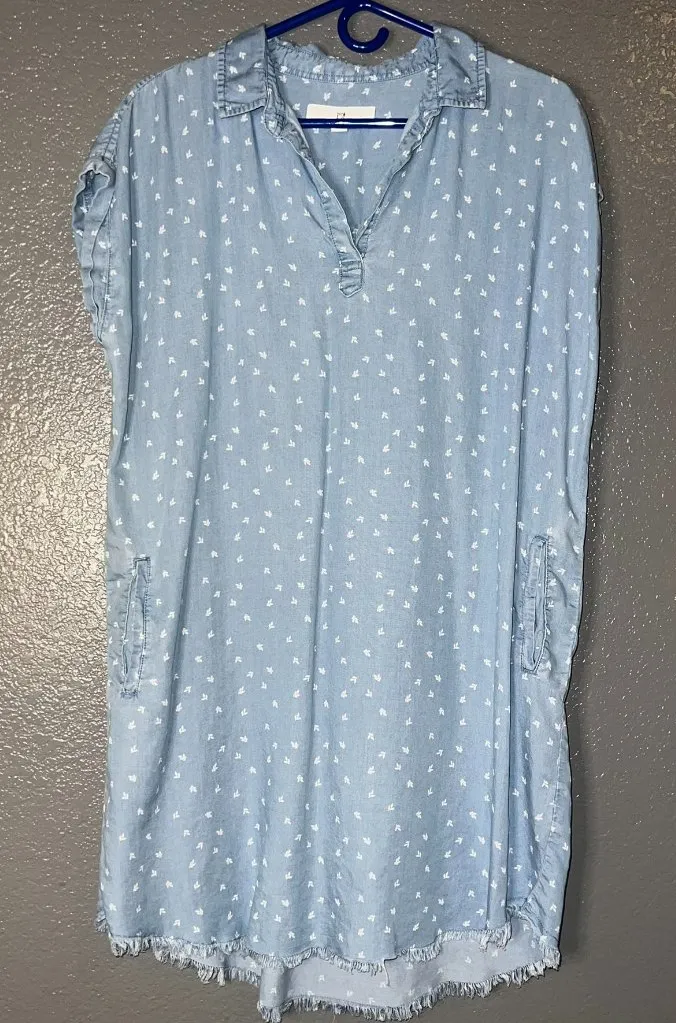 Lightweight blue chambray shirt dress with subtle white floral print and frayed hem detail. Relaxed... Show more