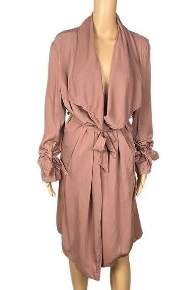This dusty rose color trench coat: -Attached belt-loops with matching belt -Waterfall drape, open cardigan -Pockets at the side hems -Sleeves have attached straps that tie. They are attached with thread and can be removed. Loops at cuffs -Fabric is really soft- No stretch. Pit to pit-23” Length-40”-45”-longest part is the front hem (Measurements appx.-Flat Lay)
