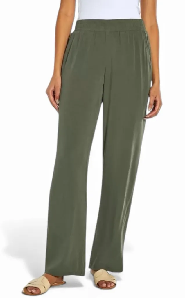 Size large Stylish olive green wide-leg pants by Three Dots. Wide pockets with comfy stretchy elas... Show more