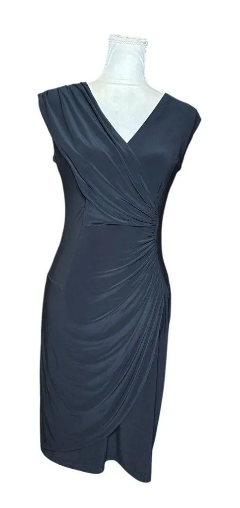 Elegant Tiana B black sheath dress featuring a flattering faux-wrap surplice neckline and softly ruched waist. Crafted in a comfortable stretch knit with a sleek, figure-skimming silhouette. Sleeveless design with a knee-length hem makes this an ideal choice for work, interviews, events, or evening wear. Brand: Tiana B Size: Small (see measurements) Color: Black Style: Pull-on, stretch knit Condition: Very good pre-owned A timeless, versatile dress suitable for year-round wear.