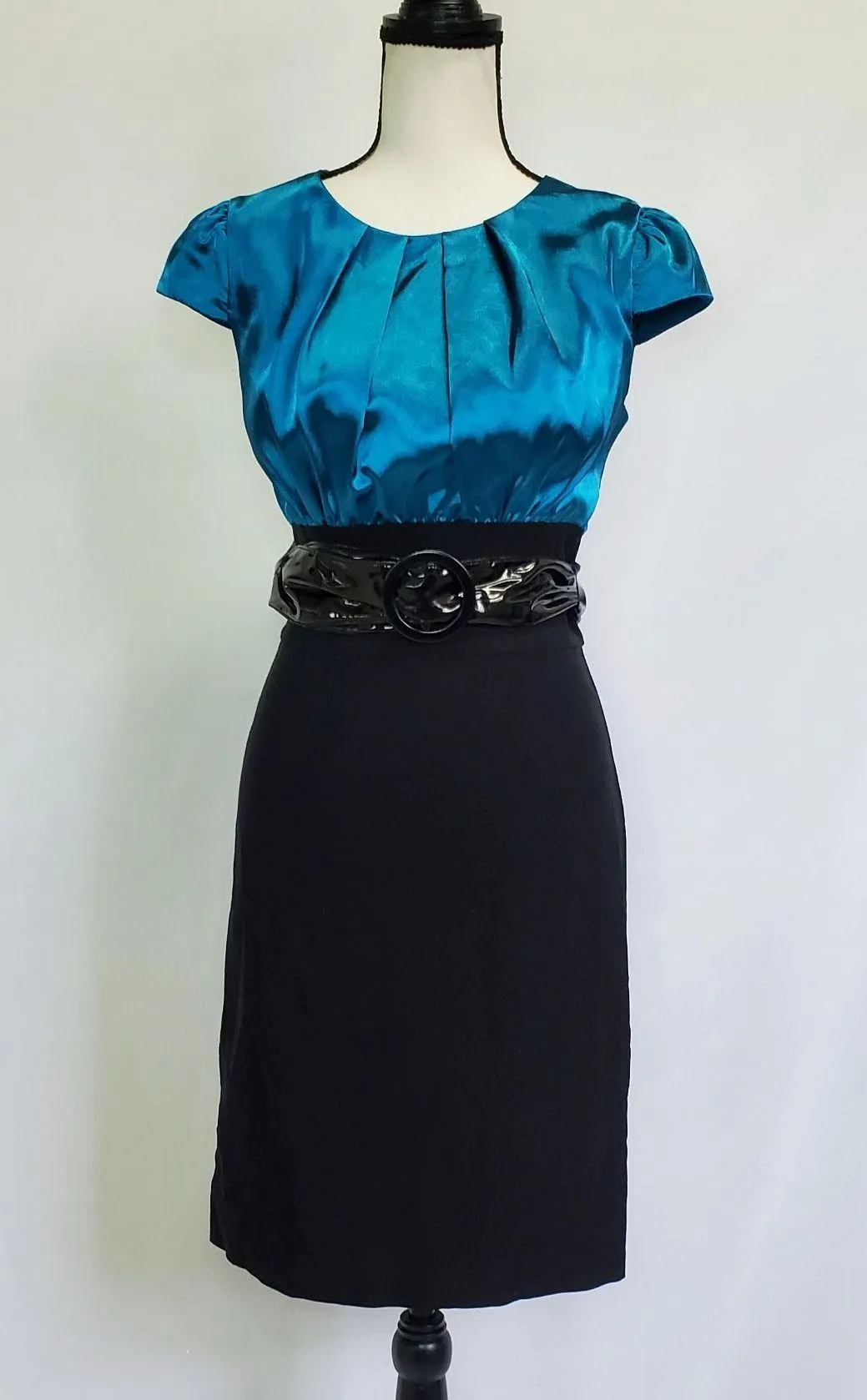 Tiana B dress. Looser fitting up top, & bodycon from waist down. Accessory belt included. Condition: used, good. Minimal wear. Size: 10 (has great stretch) Measurements (taken flat, pit to pit, doubled): bust - 34", waist - 28", length - 37" Material: shell - 97% polyester, 3% spandex, combination- 74% rayon, 22% nylon, 4% spandex, lining - 100% polyester *Orders generally ship within 24hrs*