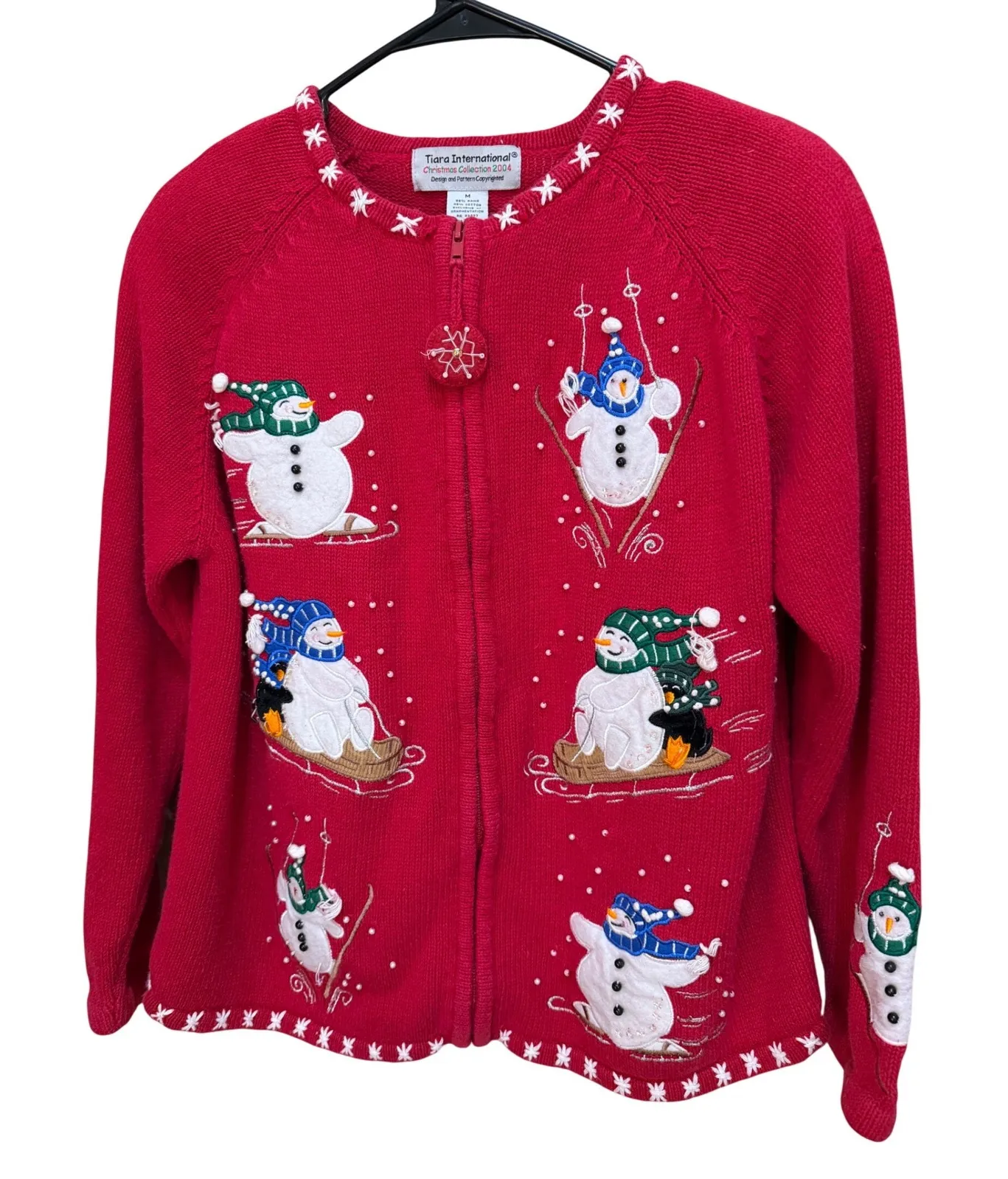 A vibrant red zip-up cardigan from Tiara International's 2004 Christmas Collection, adorned with charming appliqued snowmen and penguins enjoying winter activities. The snowflake-themed trim around the neckline and hem adds a festive touch. The front features multiple scenes of snowmen and penguins sledding and skiing, with additional motifs on the sleeves and back. Light wash wear Style: Full Zip Material: Ramie, Cotton Neckline: Round Neck Theme: Retro Type: Sweater Fabric Type: Knit Character: Snowman Accents: Embroidered, Zipper Knit Style: Tight-Knit Season: Winter Fit: Regular Keywords: Christmas sweater, winter, holiday, zip-up, appliques, embroidered, festive, cozy, whimsical, collectible, vintage !!!Please See Measurements vintage sizes run smaller than modern sizes!!! Measurements Length: 24 in Pit to Pit: 22 in Arm Length: 26 in