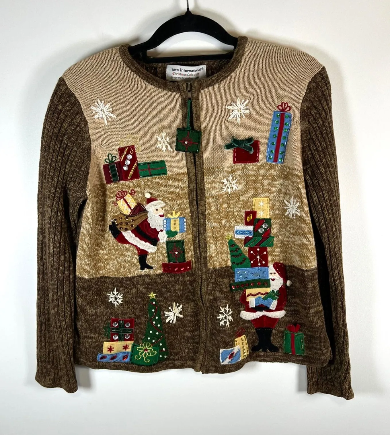 Embrace the festive spirit with this charming Tiara International Christmas Collection cardigan. Santa Claus is depicted joyfully delivering gifts amidst a whimsical snowy scene, with colorful presents and a decorated Christmas tree adding to the holiday cheer. The intricate knit details and vibrant appliqués create a cozy and eye-catching piece perfect for holiday parties or casual wear throughout the season. Measurements: • Pit to Pit: 17 in • Length: 22 in • Sleeve Length: 23 in Style: Cardigan Department: Women Material: Cotton Blend, Ramie Neckline: Round Neck Theme: Holiday, Ugly Sweater Sleeve Length: Long Sleeve Type: Sweater Features: Full Zip, Graphic Print Pattern: Fair Isle Fabric Type: Knit Character: Santa Accents: Beaded, Rhinestone, Sequin, Jewel Knit Style: Tight-Knit Keywords: ugly christmas sweater, holiday knit, santa claus, gift applique, festive, winter wear, cozy, embroidered, button front, Christmas, seasonal, casual, party