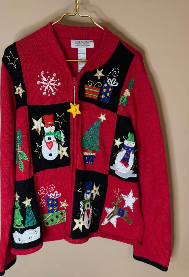 π Tiara International Christmas Collection "Ugly Sweater" Zip-Up Cardigan - Large Measurements approximate some loose sequins as shown in photos Get ready for your next holiday party with this incredibly detailed and festive cardigan from the Tiara International Christmas Collection! This sweater is bursting with embellishments, appliquΓ©s, and sparkle perfect for an Ugly Christmas Sweater event or just celebrating the season in style. The bright red and black color-block design features a fantastic array of classic holiday motifs: β’ Jolly Snowmen with scarves and top hats β’ Embellished Christmas Trees β’ Glittering Gold Stars and a star zipper pull charm β’ Wrapped Gifts β’ Reindeer β’ Mistletoe β’ Snowflakes and sparkling rhinestones #UglyChristmasSweater #ChristmasCardigan #HolidaySweater #TiaraInternational #EmbellishedSweater #VintageChristmas #Snowman #HolidayParty #Kitschy #Sequin #RamieCotton #Festive