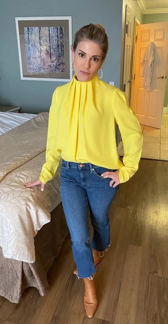 Size: 0 Color: Bright yellow Condition: Preowned in good condition **SMALL MARK ON NECK AREA OF YELLOW TOP MIGHT WASH OUT SEE PHOTOS Features: High Neck Bright yellow SIZE 0 long sleeve Hidden back zipper 25.5” shoulder to hemline Bright bold