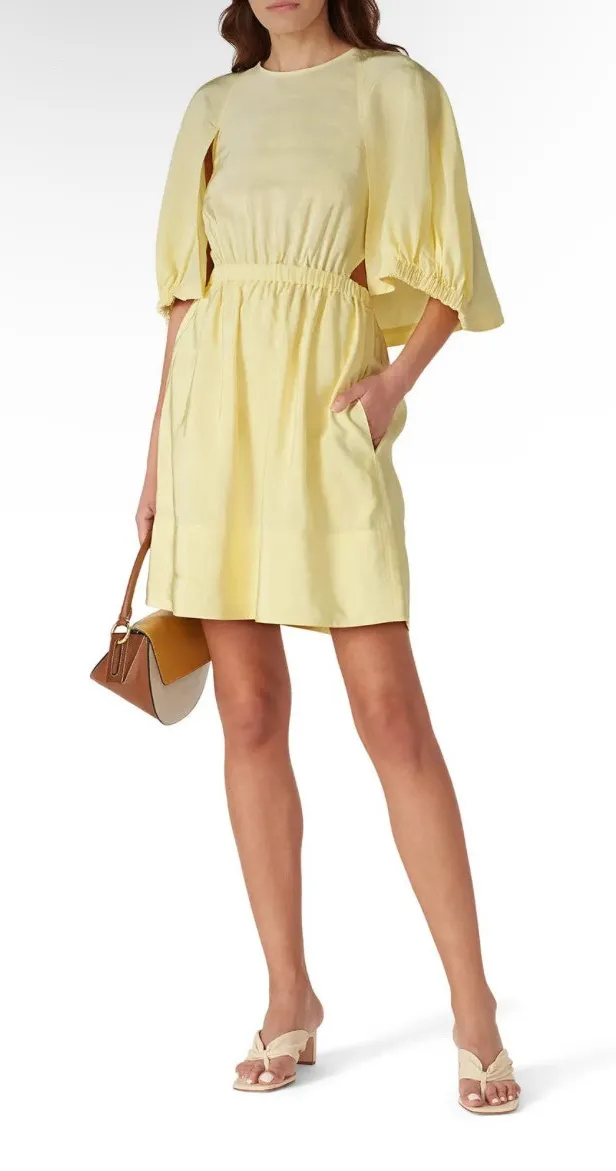 Tibi Gemma Short Cape Dress size 2 Pre-owned. No flaws. Smoke free home. Finished with a defined shirred waist, this cute Tibi cape dress will wake up your warm-weather wardrobe. Yellow linen (75% Viscose, 25% Linen). Hourglass. Crew Neckline. Short puff sleeves. Hidden back zipper with button closure. Partially lined. Side Pockets. 38" from shoulder to hemline. Imported.