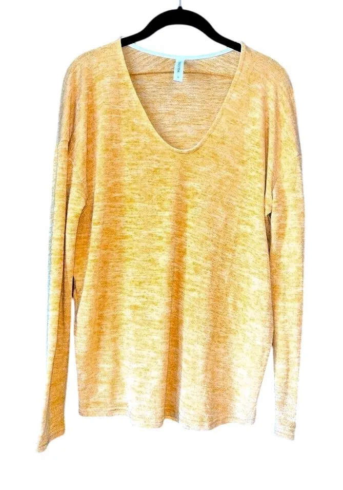 Embrace comfort and style with this versatile heathered yellow sweater. The lightweight knit fabric offers breathable warmth while the relaxed V-neck silhouette ensures effortless elegance. Perfect for casual outings, work-from-home days, or cozy weekend brunches. Layer it over your favorite tank top or wear it solo for a clean, minimalist look. The subtle texture adds visual interest while maintaining a sophisticated appearance. Keywords: v-neck sweater, yellow sweater, heathered, lightweight knit, long sleeve, casual sweater, loungewear, comfortable, layering piece, relaxed fit, spring sweater, fall sweater