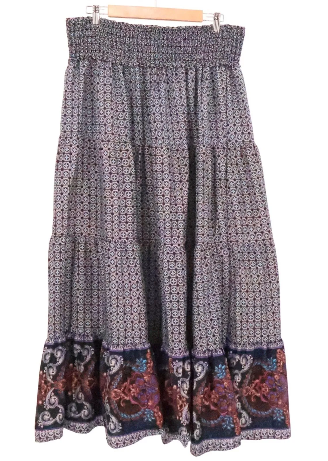 Bohemian, Comfort, Casual, Church, Going Out Smocked elastic waist, tiered, geometric paisley pattern, made in India Condition: Excellent pre-owned condition. Measurements in photos – please review measurements prior to purchase to ensure fit. Measurements: • Waist: 17.5 in (flat) • Length: 40.5 in Please note: Color may vary slightly due to lighting and screen differences. Offers welcome!