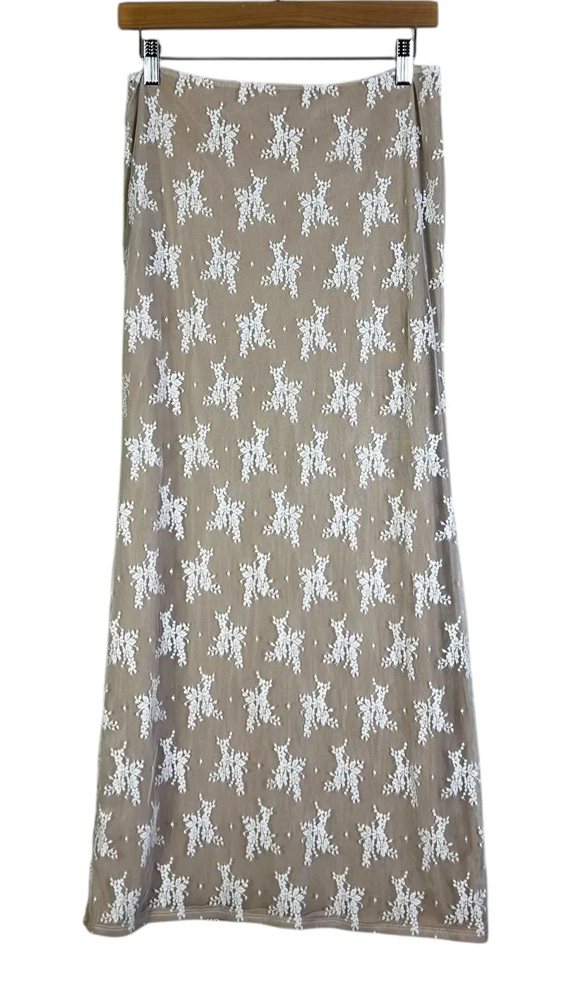 Tiger Mist maxi skirt in beige with a delicate white floral lace overlay. This elegant skirt offers... Show more
