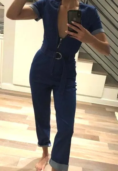 Adorable never worn jean jumpsuit! Very deep v neck. Only missing a small hook in the opening but no... Show more