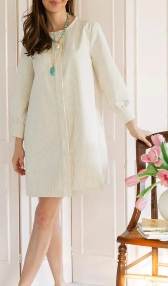 Tillie Palm Beach Hampton Dress in Seashell Stripe Sz. XS Retails $328 Great condition! Measures: 33"L,19" armpit x armpit Taking inspiration from the favorite getaway of New York socialites and creatives alike, the Hampton Dress is one everyone wants in their wardrobe. This highly requested style adds balloon sleeves to a relaxed shift and is finished with our favorite covered buttons. The fabric features a tan and beige stripe that lends itself to endless styling options. Made of 100% Cotton in NYC.