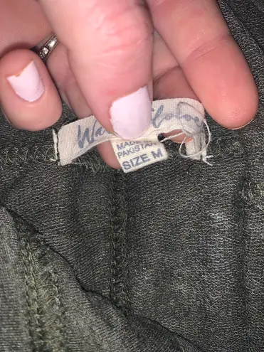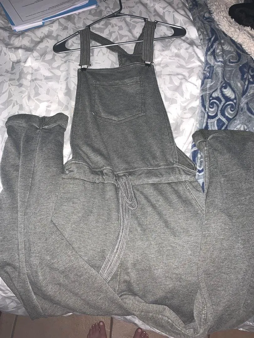 Light olive colored overalls. Sweatpant material with a drawstring waist and skinny legs. Sooo comfy... Show more