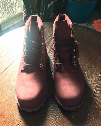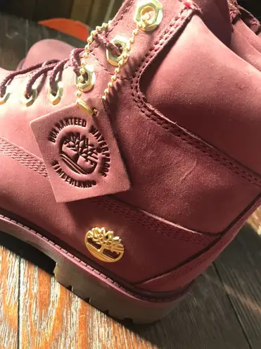 Maroon Timberland Boots barely worn maroon with gold accents missing the little keychain tag I got... Show more