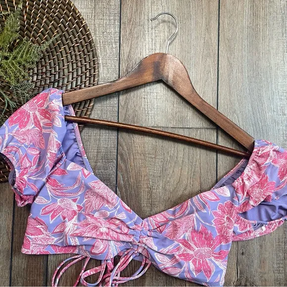 Womens Size XL Swim Bikini Top Purple Pink Floral Ruched Tie Front Short Puff Sleeve Very Good Pre... Show more