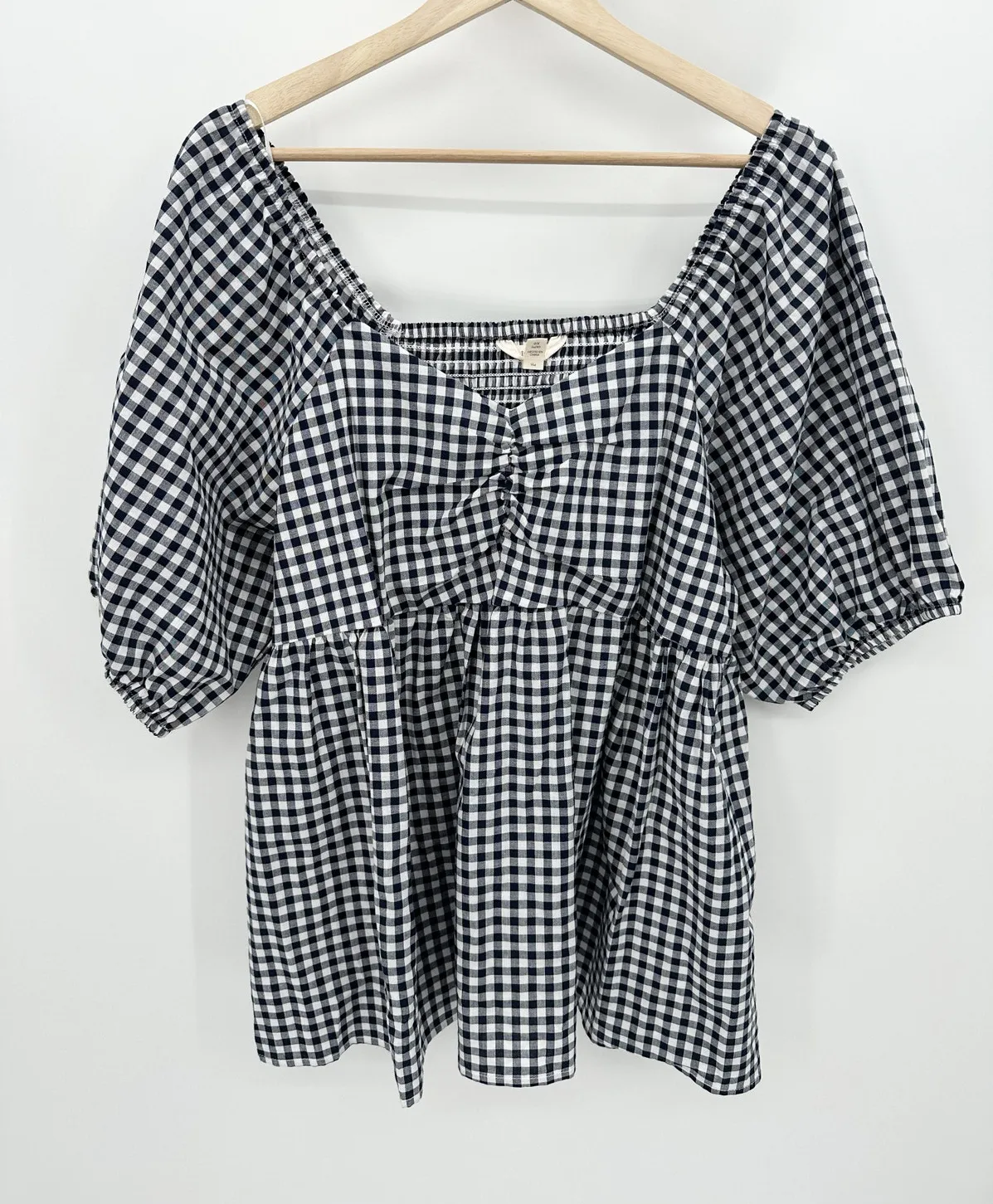 Navy blue and white gingham short sleeve sweetheart neck top. Size: 0X Condition: NWT– New with t... Show more