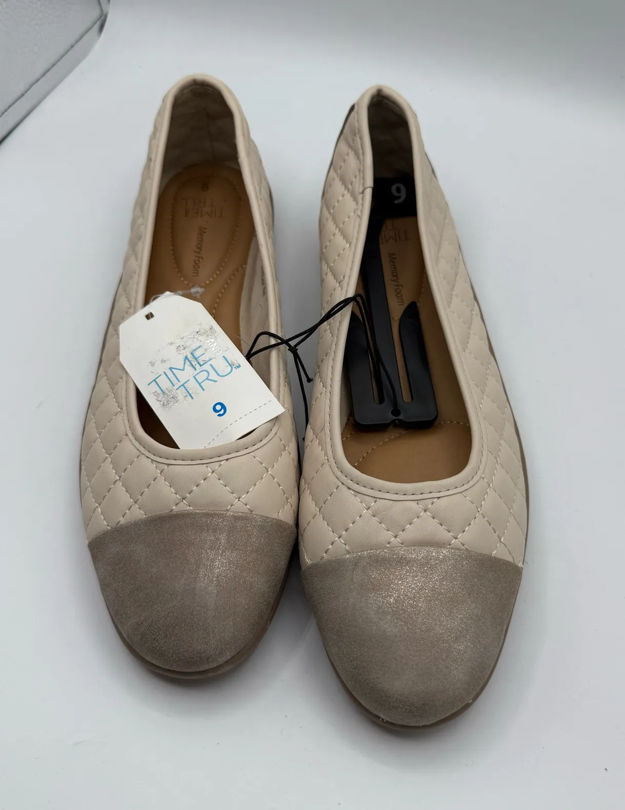 The Time And Tru Women’s Beige Slip On Flats in size 9 are a classic and comfortable addition to any woman's shoe collection. These ballet-style flats feature a slip-on closure for easy wear, a solid beige color with quilted accents, and a cushioned insole for added comfort. Perfect for a casual day out or a 90s-inspired look, these flats are both stylish and practical, making them a versatile choice for everyday wear.
