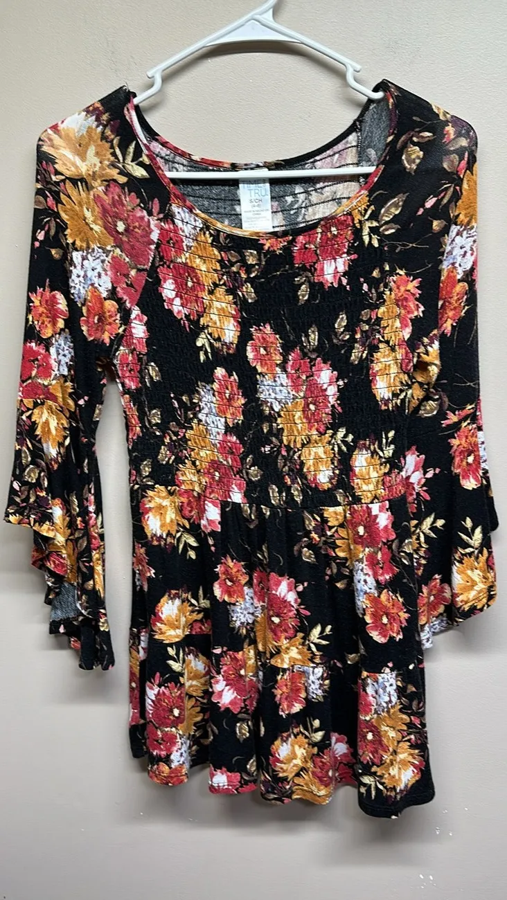 Time & Tru Womens Black Floral Smocked Tiered Ruffle Sleeve Peasant Top Small - $10 - From Teresa