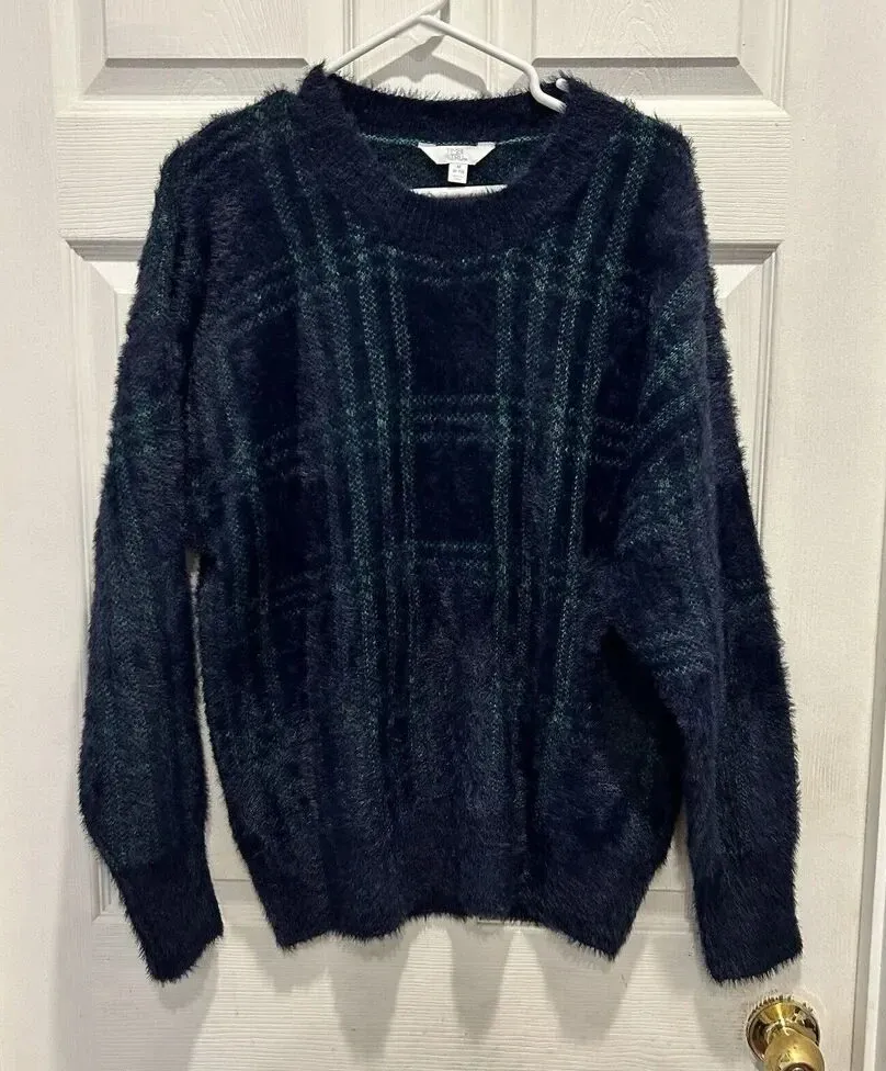 Time and Tru Women's Size 8-10 Medium Sweater Navy Blue Green Plaid Eyelash Euc. No flaws. Navy blue... Show more