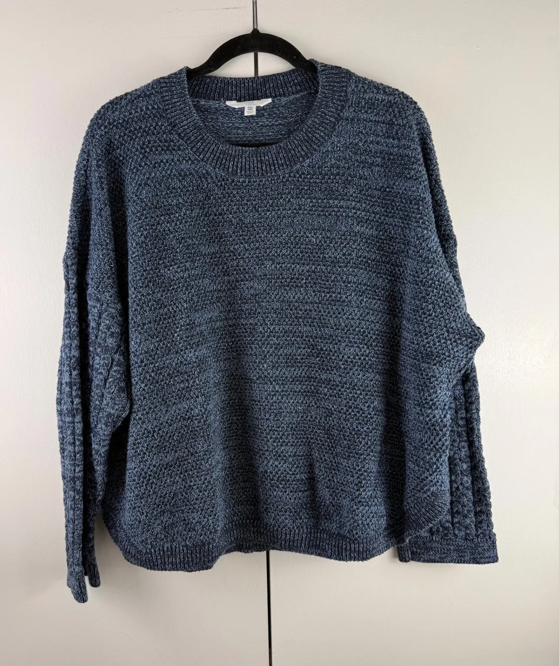 Cozy up in this wonderfully textured Time and Tru sweater. The speckled blue knit creates a visually interesting depth, while the relaxed fit and long sleeves offer ultimate comfort. Unique cable knit detailing on the sleeves adds a touch of subtle sophistication, making this a go-to piece for casual outings or relaxing at home. Measurements (approximate): • P-to-P: 27 in • Length: 23.5 in • Sleeve Length: 16.5 in Style: Pullover Department: Women Material: Cotton Blend, Polyester Neckline: Crew Neck Sleeve Length: Long Sleeve Type: Sweater Features: Oversized Fabric Type: Knit Knit Style: Waffle-Knit Season: Fall, Winter Fit: Relaxed Occasion: Casual Garment Care: Machine Washable Country of Origin: Vietnam Unit Type: Unit Keywords: Time and Tru sweater, speckled knit, crewneck sweater, long sleeve sweater, cable knit sleeves, women's knitwear, cozy sweater, casual top, winter fashion, fall apparel, textured knit, relaxed fit sweater