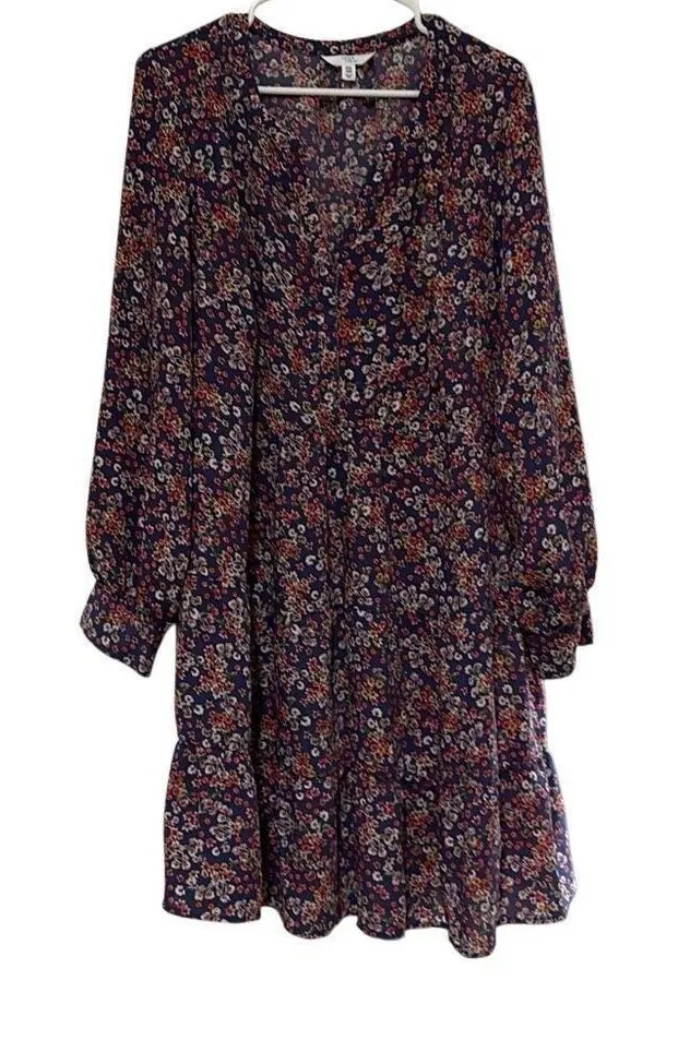 Time and Tru XXL Blue Pink Floral Tiered V Neck Babydoll Dress Long Sleeve Fall Blue pink orange fl... Show more