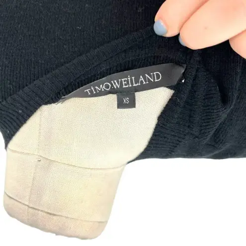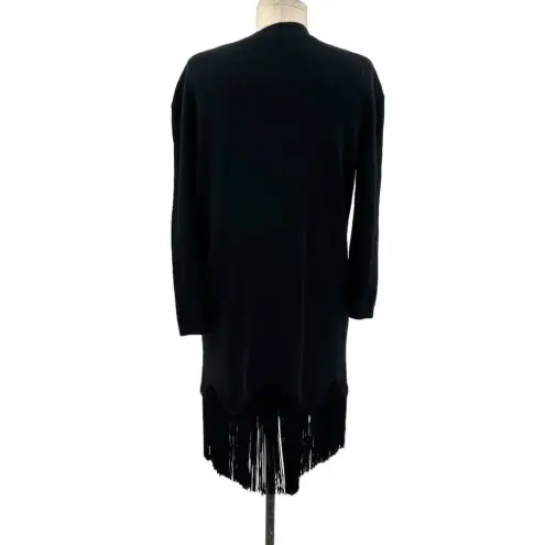 Timo Weiland Black Merino Wool Fringe Hem Sweater Dress Classic sweater dress with a twist! Features crew neckline, long sleeves, and fringe detail at hem. Pullover. 100% merino wool Size XS Armpit to armpit is approx 21" Waist is approx 20" Hip is approx 21" Length is approx 38" with fringe