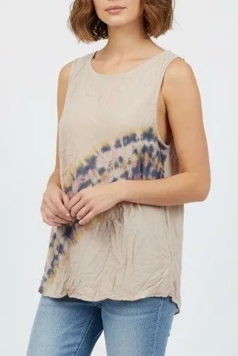 Tina Jo tie dye sleeveless tank top in a soft pink hue. This top features a diagonal tie dye pattern... Show more