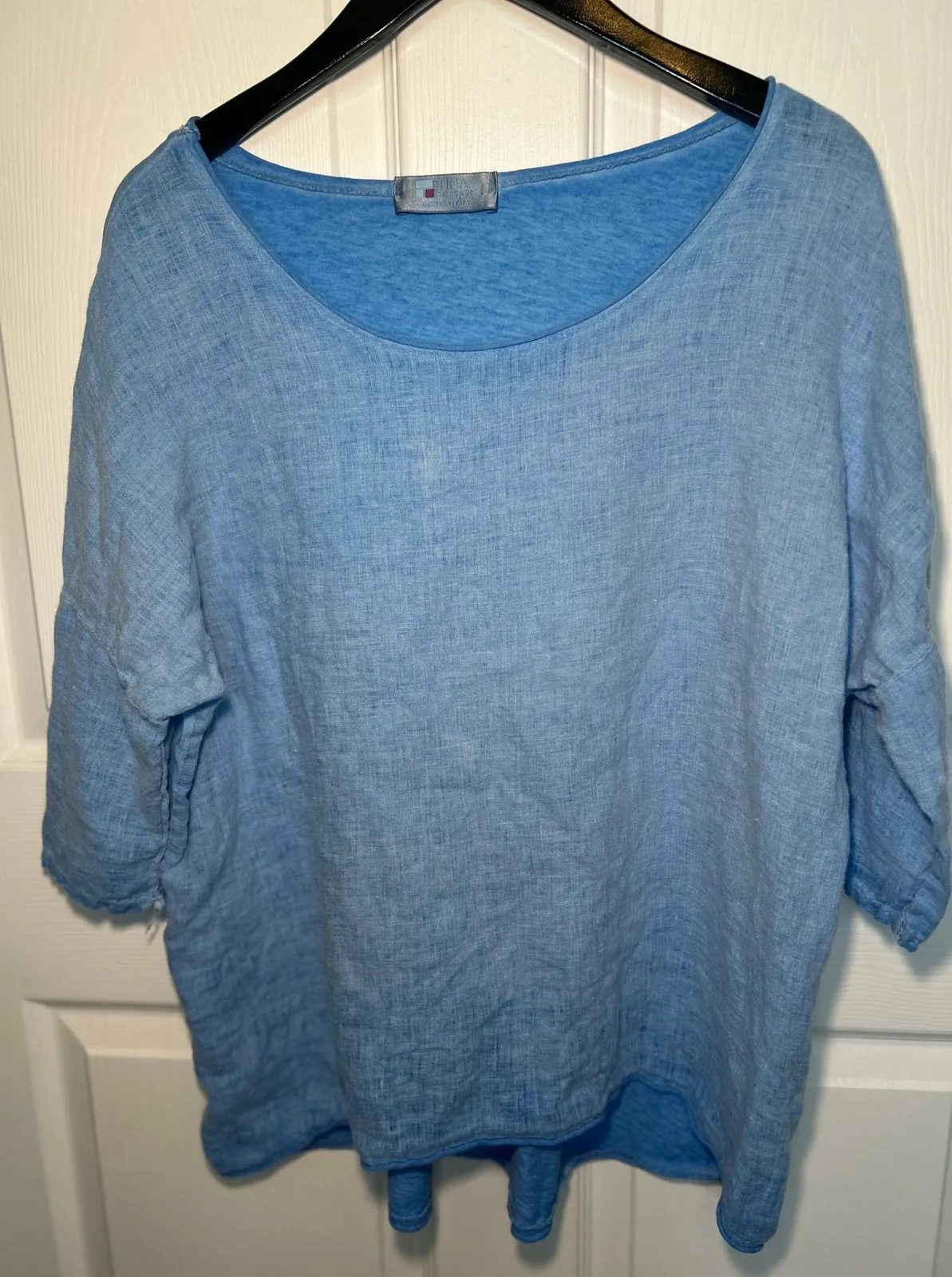 Tina Stephens linen cotton blend top in blue. One size fits most Approx 26" Long x 25" Across chest In great gently pre-owned condition, without flaws. This piece features a relaxed, oversized silhouette with 3/4 length sleeves and a flattering boat neckline. The blend of linen and cotton offers breathability and a soft feel. Type: T-Shirt Material: Linen, Cotton Neckline: Scoop Neck Sleeve Length: 3/4 Sleeve Sleeve Type: Dolman Sleeve Features: Oversized, Breathable Fit: Relaxed Garment Care: Machine Washable Keywords: Tina Stephens, linen blend, cotton blend, oversized, 3/4 sleeve, boat neck, made in italy, blue gradient, casual, relaxed fit, breathable, lightweight, summer fashion, resort wear