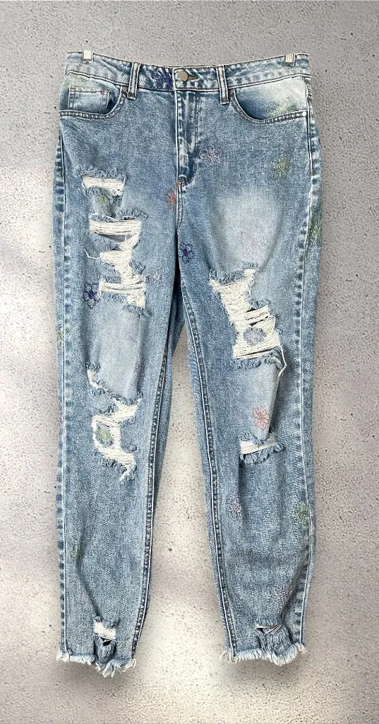 Light wash distressed jeans by Tinseltown featuring colorful floral embroidery and frayed hems for a... Show more