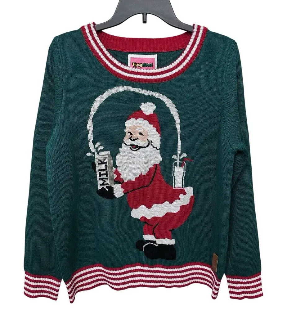 Tipsy Elves Big Booty Santa Milk Ugly Christmas Sweater Size Large Sweater is in good preowned condition. No holes or stains. Please see photos. Message me with questions Measurements Chest armpit to armpit 21" Length (top of shoulder to hem) 27"