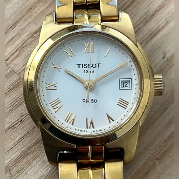 Brand: Tissot Model: J326/426 Gender: Ladies Description: Luxury watch! Gorgeous white dial with date window. Gold-tone and luminous hands and markers. Gold-tone case and bracelet. Sapphire crystal. Just cleaned and serviced with a new battery installed. Works well! Condition: Good-great. Wear on bracelet and case. Crystal is excellent. Works well! Band/Bracelet Type: Gold-tone Stainless Steel Date Window?: No Power Type?: Quartz, battery. New Fresh Battery Installed?: Yes Box?: No Additional Links?: No Notes: Please see pictures for condition and measurements. Watch pillow are for photography staging only and are not included, unless otherwise stated. From a smoke free, pet free home. Condition Notes: -NWOT: New Without Tags. Brand new item. May have super light handling marks, if any. Item may have been a window display item for a short time before safe storage. -Like New: Extremely minor handling or wear marks, if any. Item may have been worn once or twice. -Excellent: Minor, but more noticeable light wear marks on band, case, and/or very light scratches on crystal, if any. -Great: Above average condition for the age of the watch. Light to moderate surface wear or scratches. -Good: Expected wear marks for typical standard use for the age of the watch. Noticeable surface scratches on band, case, and/or crystal. -Other: Will be described if applicable.
