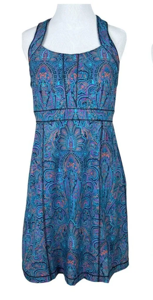 Title Nine Dress 6 Blue Purple Trouble Nimblene Paisley Built In Bra Zip Sheath Very good condition! Measurements in photos. Colorful pattern Back zip Sleeveless Stretch Above knee Small zip pocket Built in shelf bra with removable pads Polyester, spandex blend - machine wash Spring, summer, casual, athleisure, pickleball, golf