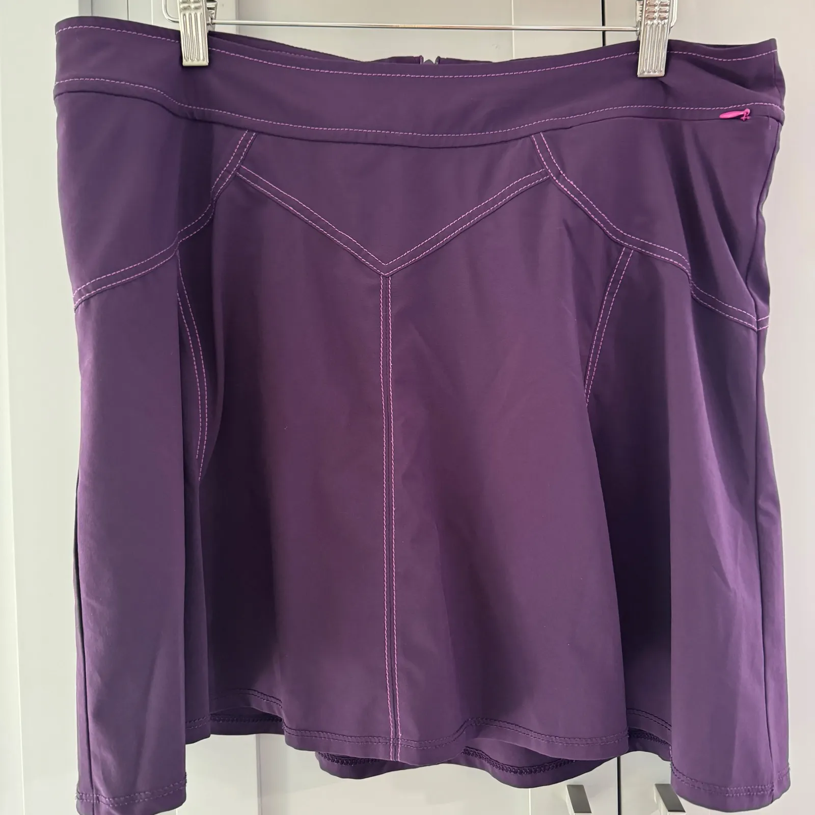 A versatile purple skort from Title Nine, ideal for athletic activities. This stylish skort combines the look of a skirt with the functionality of shorts, featuring built-in pink athletic shorts underneath. The skort boasts a comfortable waistband, a flattering A-line silhouette, and unique decorative stitching details on the front and back. It's also designed with a functional zip pocket for secure storage. Performance/Activity: Tennis, Golf, Hiking, Running & Jogging, Cross Training Features: Stretch, Lightweight, Breathable, Pockets, Comfort, Built-In Shorts Occasion: Activewear, Casual, Travel Keywords: Title Nine, skort, purple skort, athletic skort, tennis skort, golf skort, hiking skort, skirt shorts, size 12, womens skort, activewear, sportswear, outdoor apparel, running skort