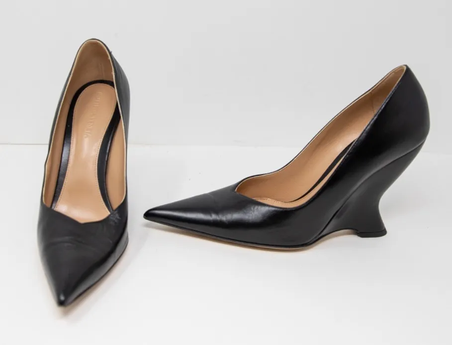 Bottega Veneta Comet 100MM Genuine Leather Pointed Toe Sculptural Wedge Heels 9 Leather upper Pointed toe Slips on Rubber-injected leather sole Heel measures aprox 4in tall [Levoff]