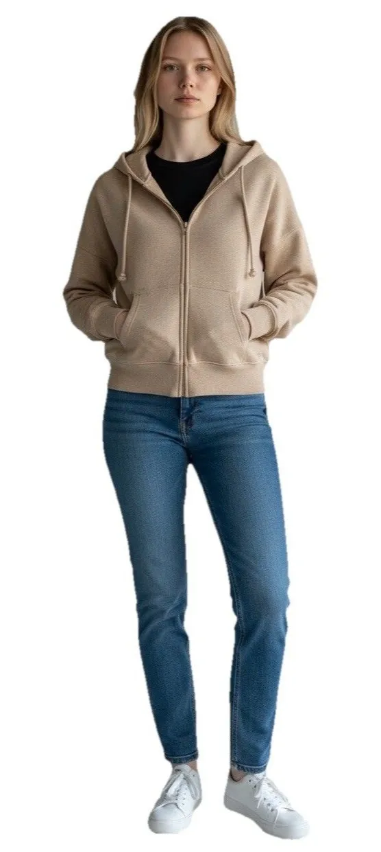 Size medium, excellent condition. Full Zip. The Aritzia TNA Cozy Fleece Boyfriend Fit Hoodie in Women's size M is a stylish and comfortable pullover hoodie perfect for activewear or casual occasions. Made from polyester and cotton blend fleece with a hood and pockets, this oversized hoodie features embroidered logo accents and a solid beige color.