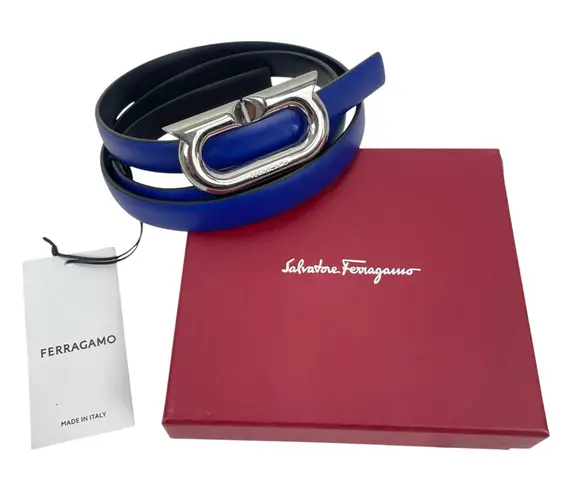 NEW Salvatore Ferragamo Gancio Ellipse Skinny Leather Belt Women Brand: Salvatore Ferragamo Size: Women 80cm/ 32inch Condition: New with tag & gift box, no dust bag Material: Leather Detail: Black & royal blue color Silver Buckle Smooth calfskin leather Elliptical rendition on iconic Gancio buckle 5 prong adjustment Sleek look Skinny belt Made in Italy MSRP $430 Guarantee authentic Measurement: Size: 36.5"L x 0.5"W (31.5" to middle hole) Buckle: 2.5"L x 1.4"W Style Tags: Salvatore Ferragamo, Ferragamo Belt, Gancio Belt, Ellipse Buckle, Skinny Leather Belt, Designer Accessories, Women’s Size 80, Size 32", Luxury Leather, Italian Designer, Signature Gancio, Minimalist Luxury, High-End Fashion, Wardrobe Essential, Giftable Accessories, Holiday Gift Idea, Luxury Gift, Designer Gift, Gift for Her, Christmas Gift Idea, Perfect Holiday Present, NEW with Tags.