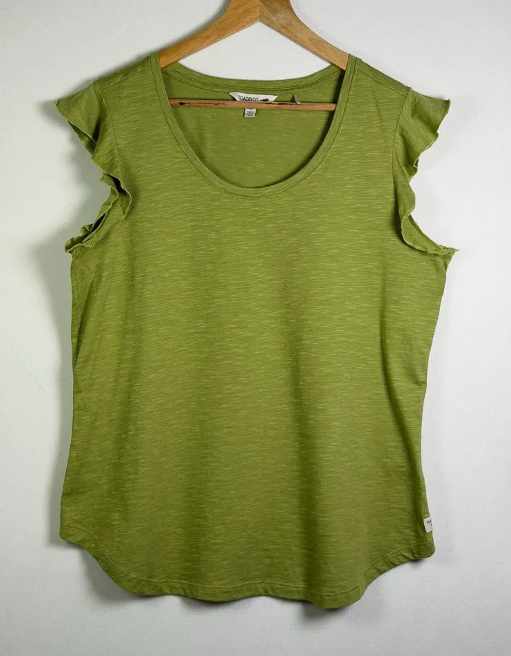 Effortless everyday style meets sustainable comfort in this Toad&Co green short sleeve top. Designed with soft flutter / ruffle sleeves, a flattering scoop neckline, and a gently curved hem, this piece is perfect for casual wear, travel, or elevated athleisure. Crafted from an eco-friendly organic cotton + TENCEL™ lyocell blend with stretch for all-day comfort. A versatile staple that pairs beautifully with jeans, linen pants, or layered under a jacket. Color: Green / Olive Brand: Toad&Co Size: Women’s Large Condition: Excellent pre-owned condition – no holes, stains, or odors noted ⸻ Features • Sustainable eco-friendly fabric • Organic cotton & TENCEL™ lyocell blend • Soft stretch knit feel • Feminine ruffle / flutter sleeves • Scoop neckline • Curved hem for a flattering drape • Lightweight & breathable • Casual, boho, minimalist, everyday wear ⸻ Measurements (laid flat, approx.) • Underarm to Underarm: 20” • Length: 25” Please compare measurements to your favorite top for best fit. ⸻ Fabric Content • 59% Organic Cotton • 38% TENCEL™ Lyocell • 3% Elastane Machine washable (see care tag for details). Toad&Co women top, sustainable fashion, organic cotton shirt, TENCEL lyocell top, eco friendly clothing, green ruffle sleeve top, flutter sleeve blouse, casual boho top, minimalist wardrobe staple, ethical fashion brand, everyday tee, soft stretch knit top, travel wear women, capsule wardrobe top