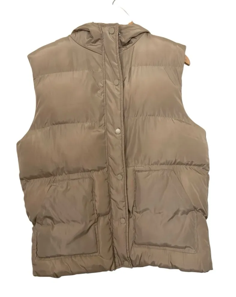 Stylish tan Khaki puffer vest with a hood. Features front pockets and snap buttons. Great preowned condition Flaws: markings on right pocket; refer to last photo 100% Polyester, designed in Australia Flat Lay Approx. Measurements P2P: 23in Length: 26in